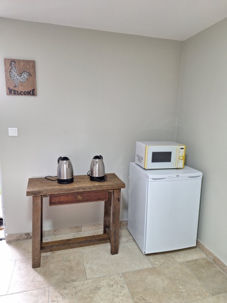 Equipements : Micro ondes, frigidaire, bouilloires, machine à café, petites vaisselles